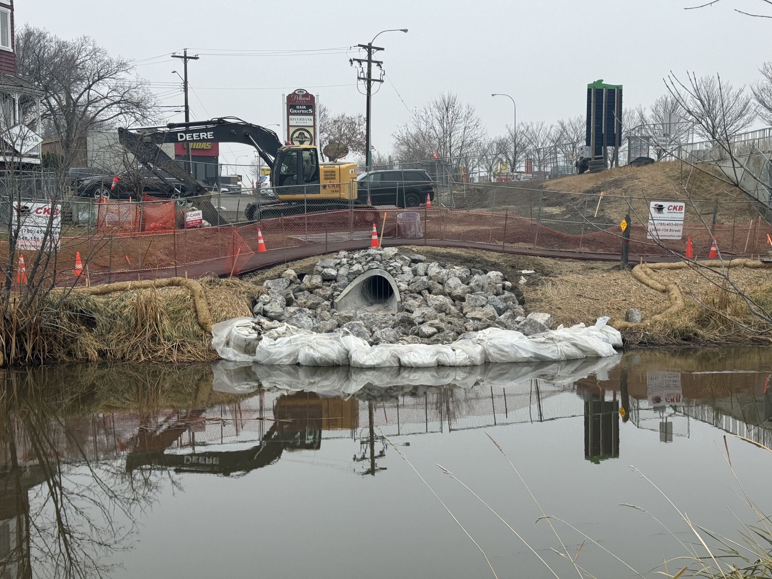 While implementing specific mitigation measures to protect the environment during the instream work, CKB completed the removal of the concrete outfall piping and flared ends and installed new piping and end walls. Deep well dewatering was completed to install the new Oil and Grit Separator required to capture sediment and oil. Existing sinkholes were remediated and the new outfalls were completed with the installation of rip rap and other erosion protection materials, chain-link fence, and landscaping.